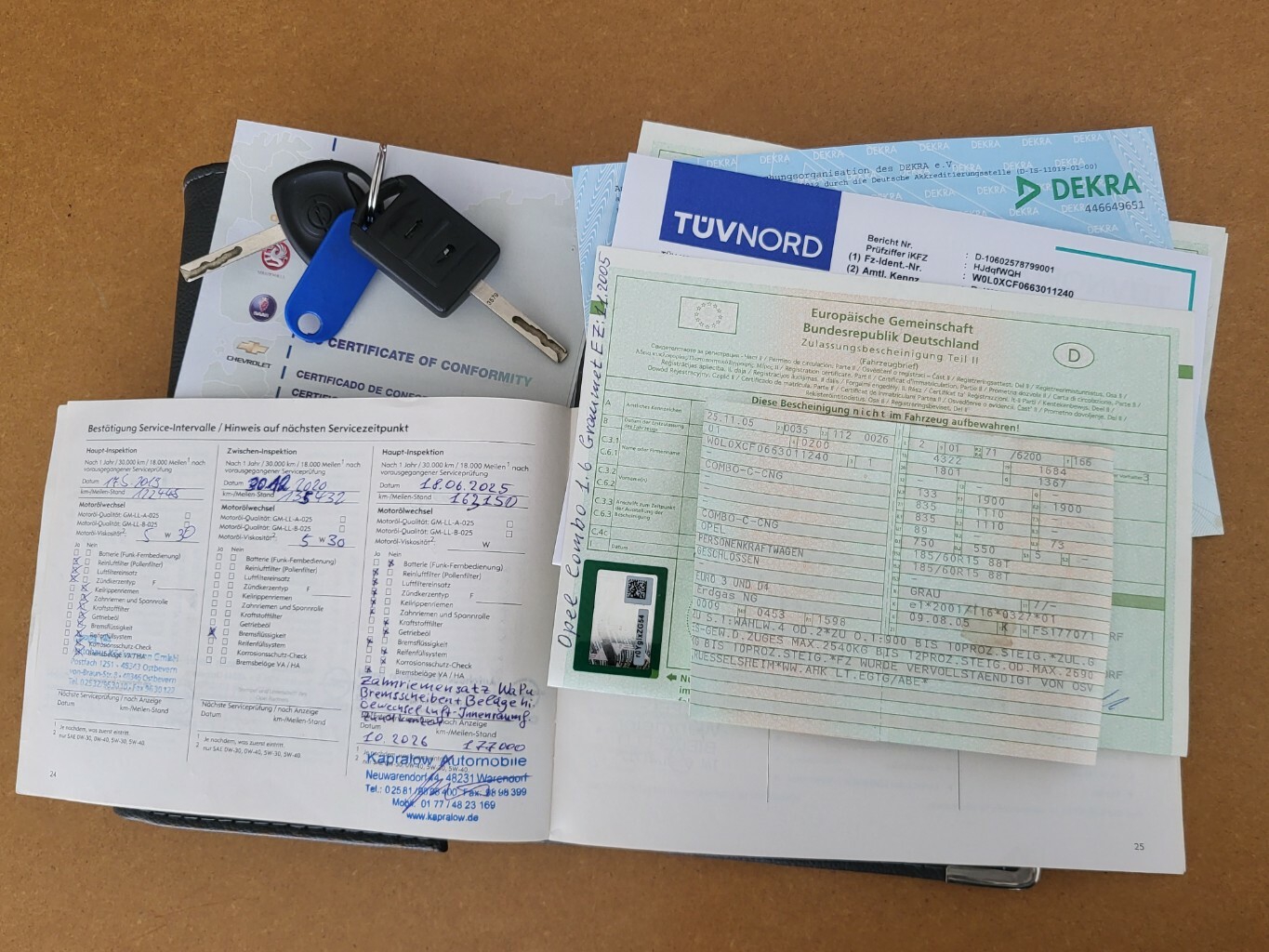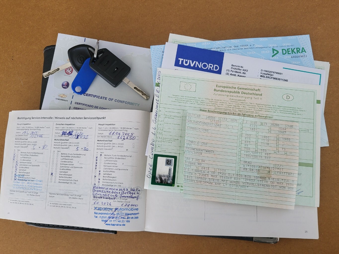 - Opel Combo 1.6L Edition Benzin/ CNG Erdgas ab Werk Elektro-Komfort-Paket Unfallfrei Scheckheftgepflegt, Große Inspektion mit Zahnriemensatz WaPu Thermostat Keilrippenriemen Ölwechsel mit Luft und Innenraumfilter Zündkerzen Bremsscheiben mit Belägen an der Hi. Achse von ATE Neu 15 Zoll Opel Alufelgen mit M+S Reifen, TÜV/ AU bis 06.2027 3 Vorbesitzer, AHK mit 750kg Anhängerlast, Sparsam und Umweltfreundlich unterwegs ca. 25, - EUR Betankung mit Erdgas 20kg/ Reichweite ca. 380km und Nottank Benzin 10L ca. 18, - EUR/ ca. 200km bei Bedarf schaltet Automatisch von Erdgas auf Benzin mit gleicher Tankanzeige, Fahrzeug ist noch Angemeldet und kann nach Absprache Besichtigt und Probegefahren werden